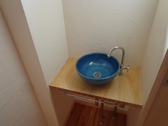 玄関には趣のある陶器の手洗いボウル |